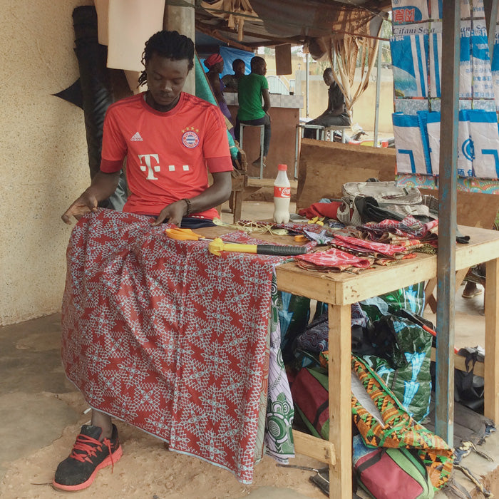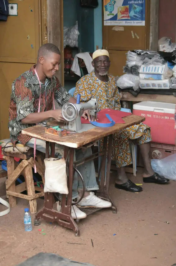Zoumana Sanou, couturier principal, artisan talentueux de Bobo Dioulasso, collabore avec Doris depuis 2020 dans la création de sacs. Ensemble, elle envoie dessins et mesures, qu’il transforme en échantillons et prototypes. Lors des séjours de Doris, ils perfectionnent ensemble les modèles avant de lancer de petites séries testées auprès des clients. Grâce à kokoso, Zoumana dispose désormais d’une machine à coudre industrielle et travaille depuis chez lui, incarnant la force d’une collaboration artisanale et internationale.