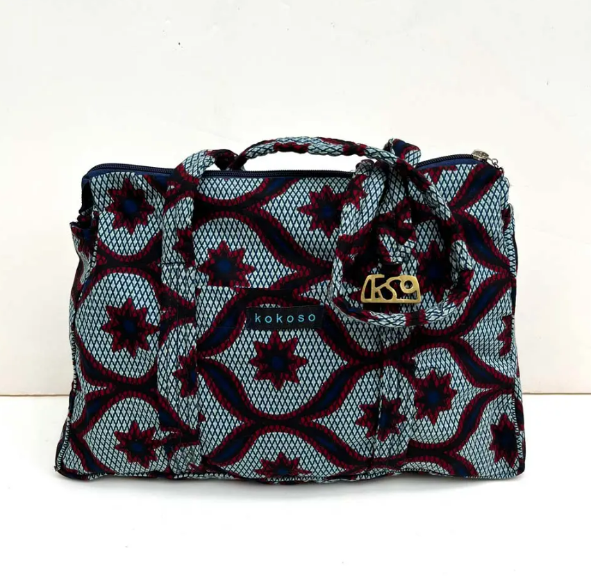 Sac à main en coton coloré, avec deux poches à l’intérieur et une à l’extérieur.