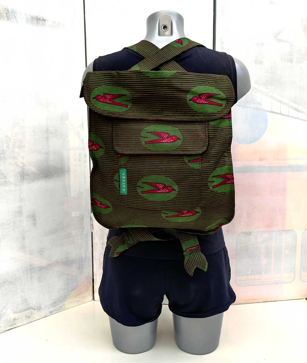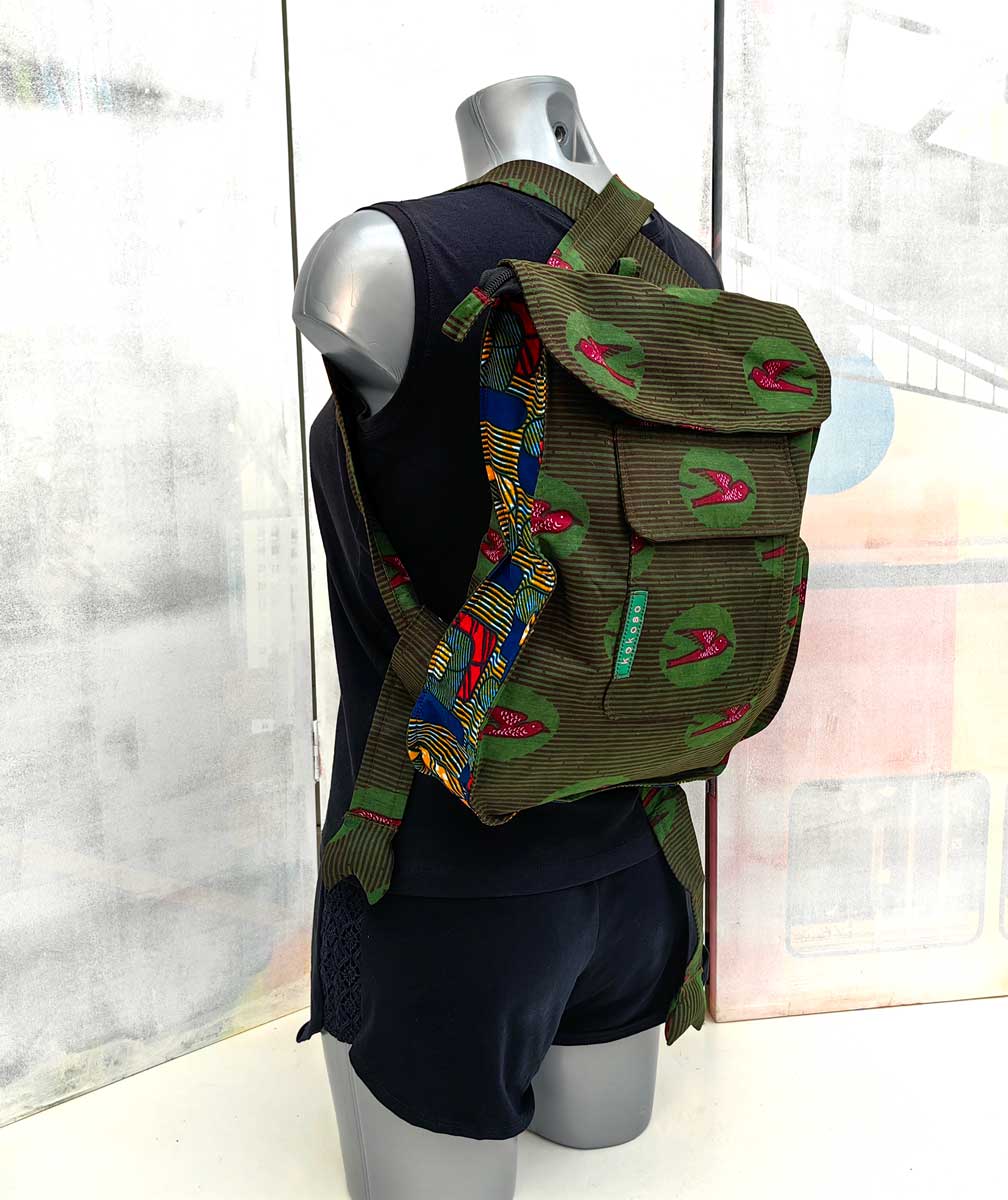 Il est confectionné en coton "Wax africain" doublé, cousu à la main par Zoumana Sanou à Bobo Dioulasso.
