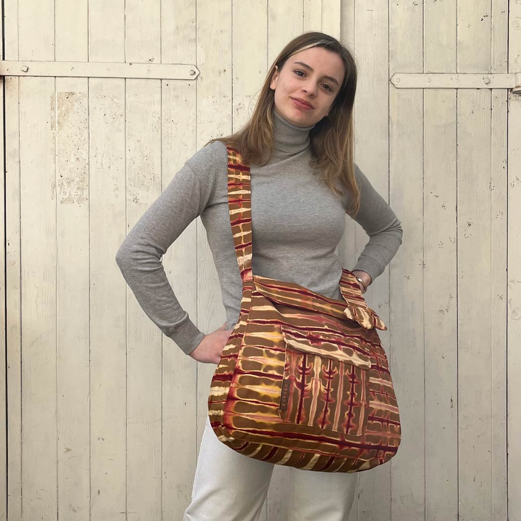 Grande sacoche en kokodunda, un batik artisanl qui se fait à Bobo Dioulasso, réglable par un noeud comme on le voit sur des photos