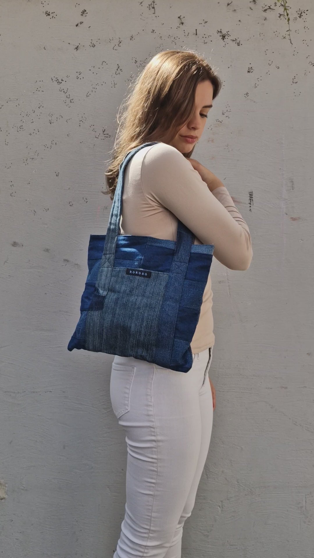 Upcycled sac en Jeans avec fermeture, doublé de wax, avec une poche à l'intérieur et une à l'extérieur.