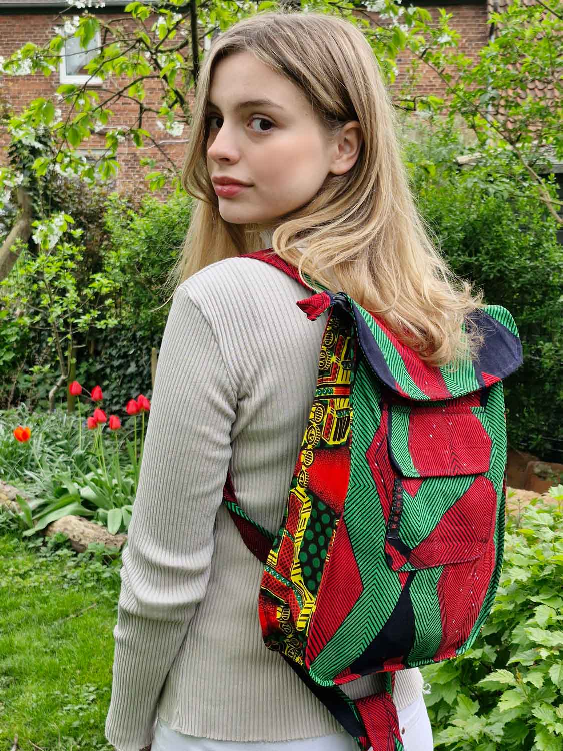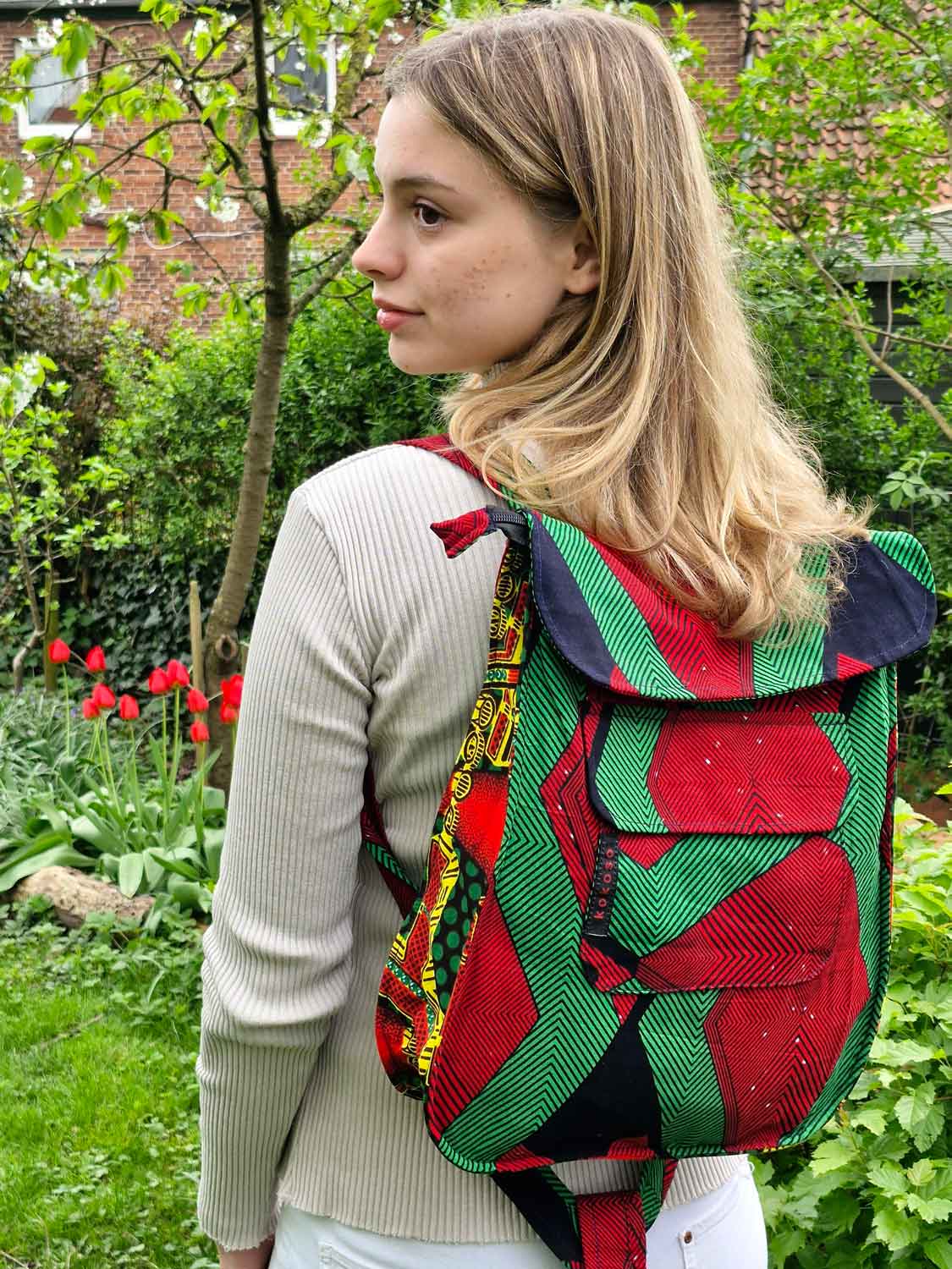 Grand sac à dos en coton doublé. Agréable et léger à porter il offre beaucoup de place à l'intérieur. Il a une poche à l'intérieur, et à l'extérieur une devant et une derrière.